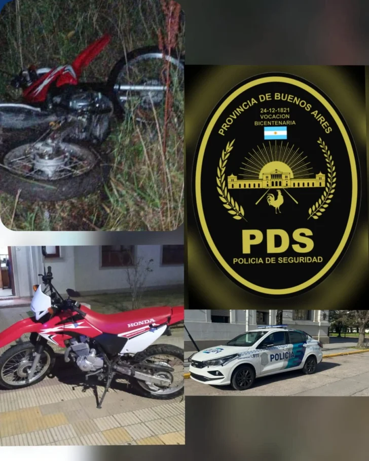 La Jefatura de Policía Comunal Benito Juárez informó que alrededor de las 21 horas del viernes se toma Conocimiento de la sustracción de una motocicleta Honda Tornado 250 de la zona céntrica de esa ciudad, de forma inmediata se pone en alerta todo el sistema de seguridad como ser Móviles de cuadrícula, servicio de calle, cámaras de Monitoreo de seguridad local y Secretaría de seguridad, logrando minutos después hallar la motocicleta oculta en un descampado.