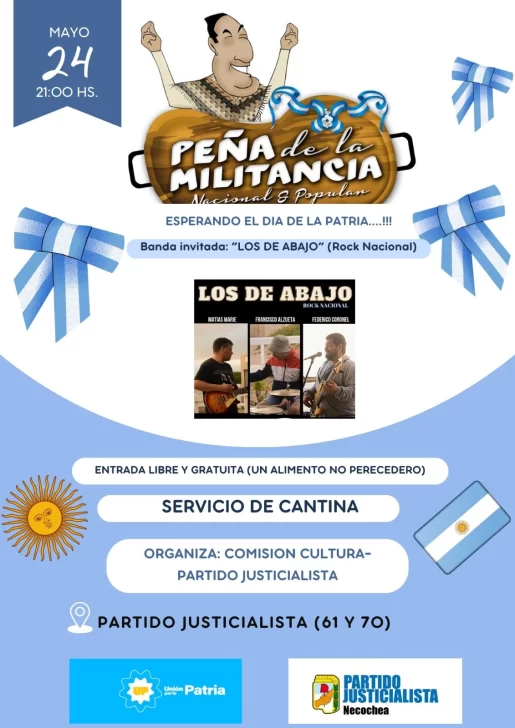 El próximo viernes 24 de mayo, a las 21, en la sede de calle 61 esquina 70, la Comisión de Cultura del Partido Justicialista distrito Necochea, organizó una peña solidaria con la actuación del grupo de rock nacional “Los de Abajo”.