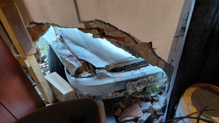 Una mujer de 52 años, que conducía un Chevrolet Corsa gris, perdió el control del vehículo tras intentar esquivar un pozo y caer en otro de mayor tamaño. Como consecuencia, el auto terminó impactando de lleno contra una de las paredes de una vivienda, ingresando al sector del comedor.