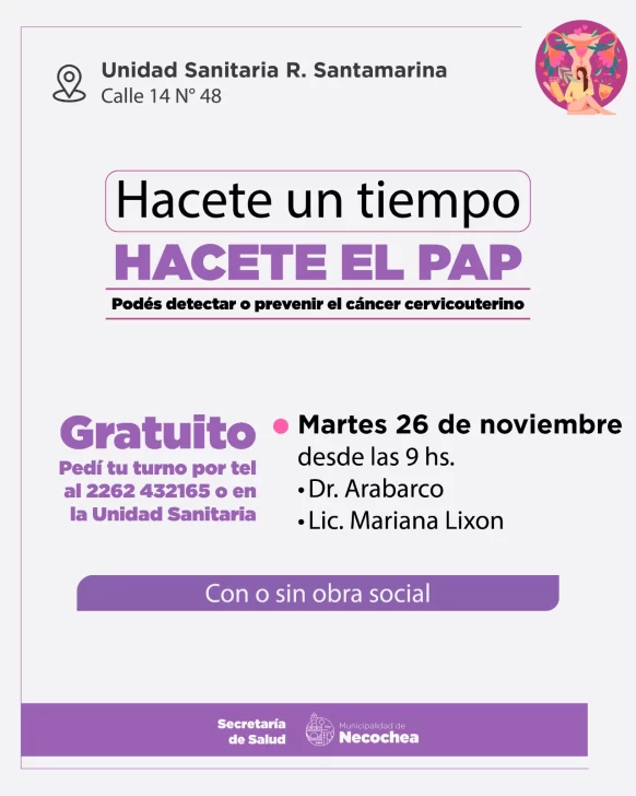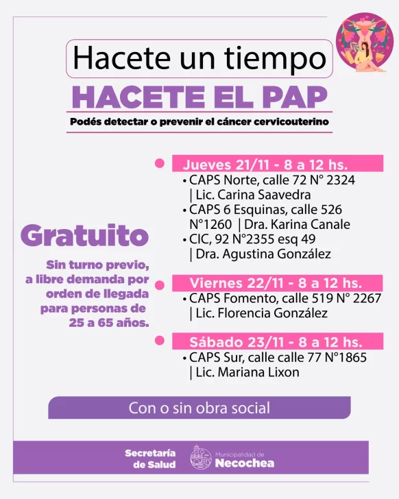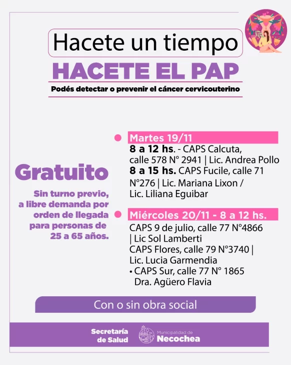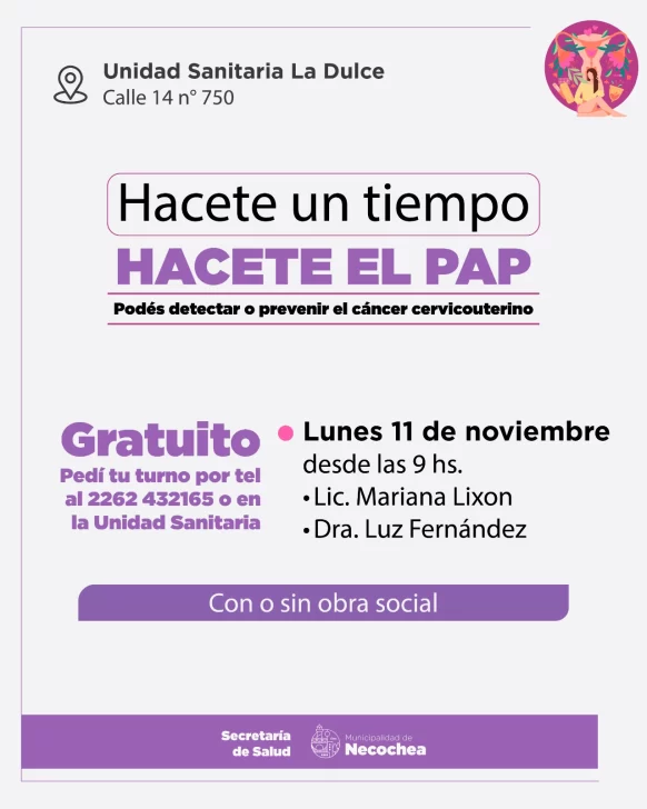 Con el objetivo de detectar o prevenir el cáncer cervicouterino, la Municipalidad de Necochea, durante noviembre, lanza una campaña gratuita de control de Papanicolaou (PAP) bajo el lema «Hacete un tiempo, Hacete el PAP».