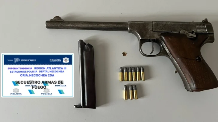 Durante la requisa, los efectivos hallaron una pistola automática calibre 22, marca T.A.L.A., con nueve municiones en su cargador, sin la correspondiente documentación legal.