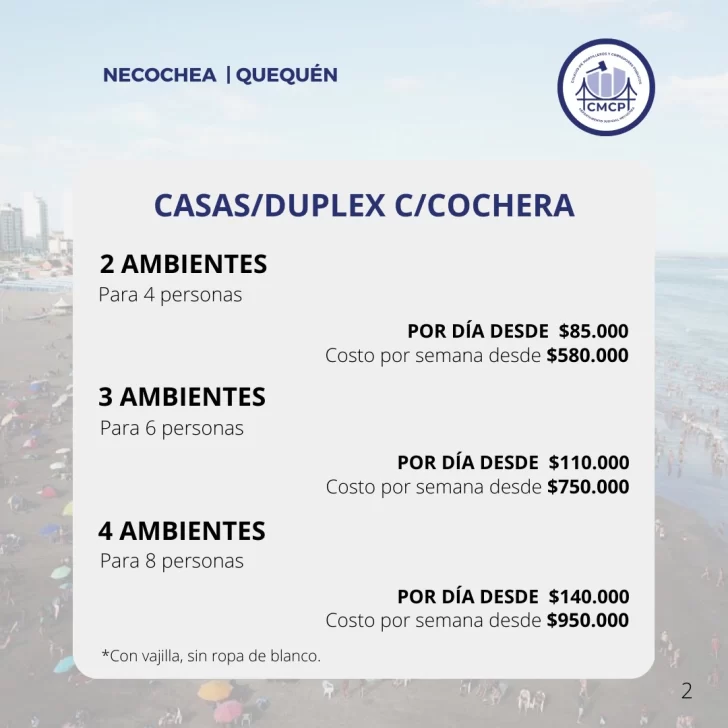 -Propiedades de dos dormitorios (6 personas): desde $130.000 diarios.
