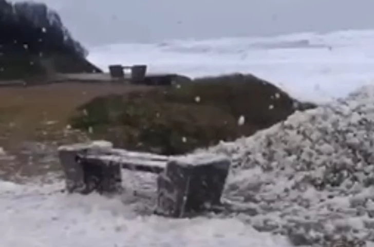 Esto sucede en la costa de Quequén, donde la espuma del mar se desprende de las olas, vuela y se posa sobre la arena.