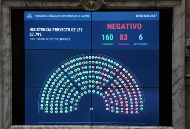 El voto negativo a la insistencia, que en la práctica significa un respaldo al veto presidencial, provino mayoritariamente de los bloques de La Libertad Avanza y el PRO, aunque también sumaron su apoyo un sector de la UCR y otros bloques provinciales. A continuación, el listado completo:
