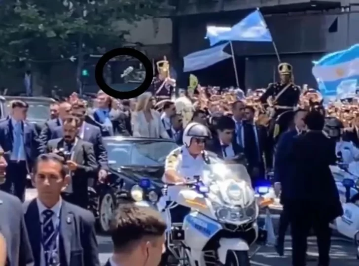 La ceremonia transcurría con normalidad hasta que por la Avenida Rivadavia al 1600 el mandatario y su hermana, Karina Milei, casi resultan heridos por una botella de vidrio que vuela desde el cordón de simpatizantes.