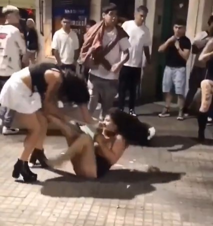 El video muestra una gresca muy violenta entre jóvenes en plena calle: golpes de puño, patadas, tirones de pelo y rotura de ropa.