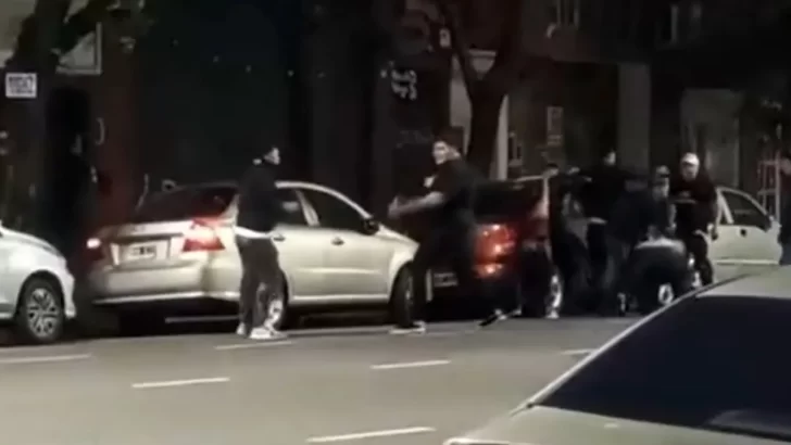 En las imágenes captadas por los celulares de los testigos, se observa a un grupo de hombres peleándose a piñas y patadas entre los autos estacionados sobre la avenida.