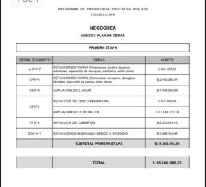 Ellas son la refacción de cubiertas (techos) para la EEST N° 2 Mariano Necochea por un valor de $8.023.078 y obras de refacción del cerco perimetral y ampliación del sector taller para EEST n1 Mario El puerto por un valor aproximado de $12.000.000.