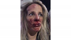 “El primer impacto es de adelante, cuando me noquea. Me pega en la cara, creo que en la boca”, siguió la mujer, con marcas visibles en su rostro. “Después me di cuenta de que me había arrancado los pelos, me empezó a pegar rodillazos, caí en el piso y me pateó. Un criminal”, continuó.