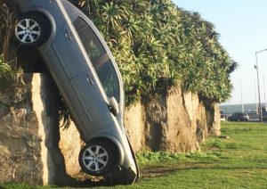 Un espectacular choque tuvo lugar esta mañana en la costa cuando un renault gris colisionó contra dos autos estacionados, provocando que uno de ellos atravesara el paredón costero y cayera por la pendiente del Paseo Dávila.