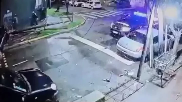 La imagen llega a mostrar el momento en que uno de los jóvenes se agarra la cabeza cuando ve al móvil policial impactar contra el auto estacionado, pero era tal la velocidad a la que iban los policías que no alcanzó a correrse.