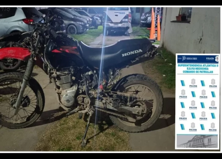 Personal policial del Comando de Patrullas Necochea, en conjunto con agentes de Tránsito Municipal, detienen este lunes a un joven de 21 años, mientras circulaba a bordo de una motocicleta Honda XR 150 cc color negro sin dominio colocado, en la intersección de calle 2 y Pinolandia.