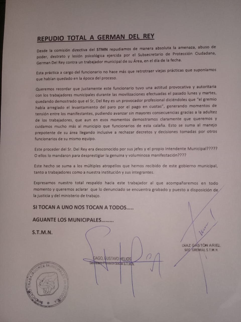 El Sindicato de Trabajadores Municipales cuestionó con dureza al subsecretario de Protección Ciudadana, a quien acusan de ejercer abuso de poder sobre un trabajador del área cuando se desarrollaba el paro de actividades en reclamo del pago de haberes del mes de agosto.