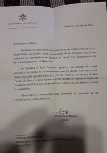 “Su Santidad el Papa Francisco agradece esta muestra de cordial cercanía y los anima en su compromiso con los demás. Con estos vivos deseos les pide que recen por él y por los frutos de su servicio al santo Pueblo de Dios, al mismo tiempo que les imparte de corazón la implorada Bendición Apostólica que complacido hace extensiva a sus familias y demás seres queridos. Aprovecho la oportunidad -se agrega- para expresarle el testimonio de mi consideración y estima en Cristo” indica la misiva firmada del asesor monseñor Paolo Borgia