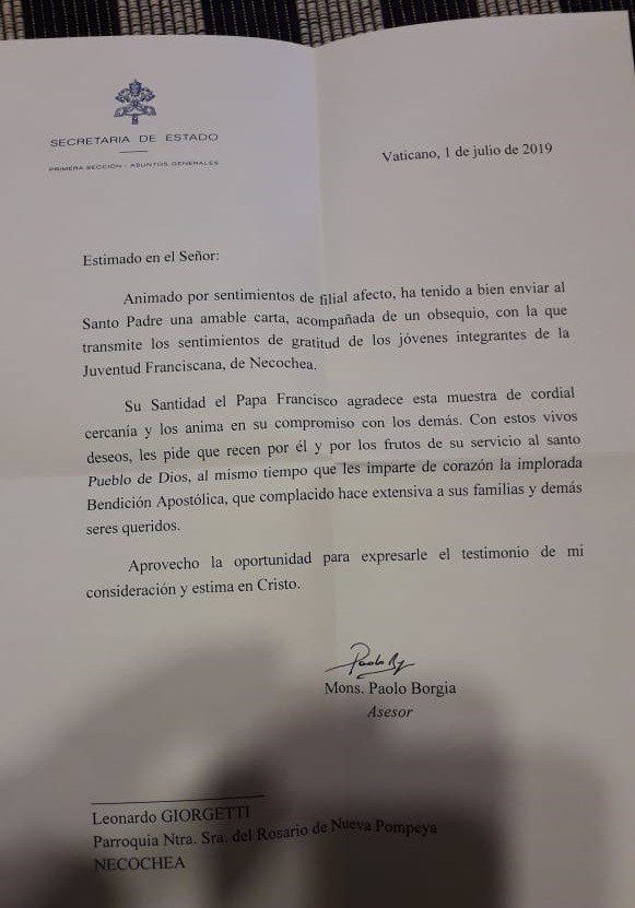 El precandidato a intendente de la ACT, Leonardo Georgetti, recibió desde la Secretaría de Estado del Vaticano, por parte del Papa Francisco, una carta agradeciendo “los sentimientos de los jóvenes integrantes de la Juventud Franciscana de Necochea”.