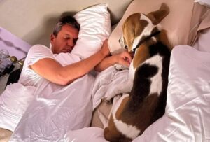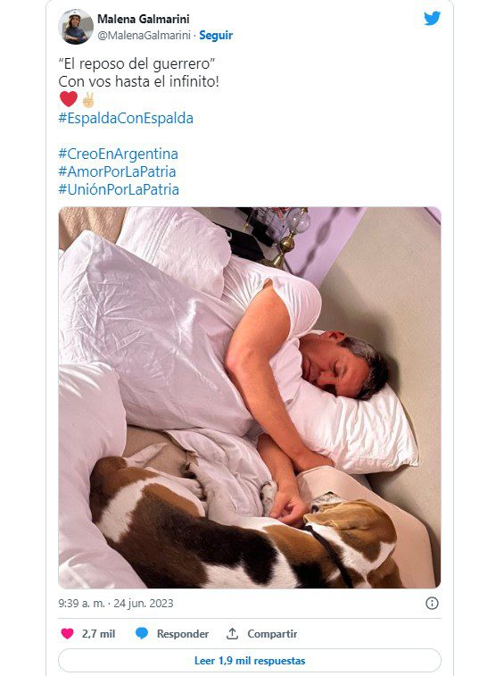“El reposo del guerrero. ¡Con vos hasta el infinito!”, expresó Galmarini en su cuenta de Twitter, acompañada de una foto en dónde se lo ve a Massa durmiendo en su cama junto con el perro de la familia.
