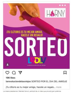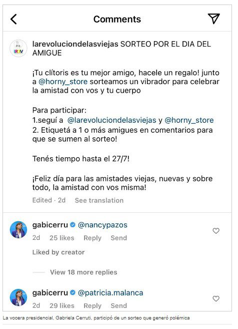 En su cuenta de Instagram, a la que Cerruti califica como personal, pero donde también comparte actos de gobierno, la funcionaria se sumó al “sorteo por el día del amigue” (sic) que lleva adelante la agrupación “La revolución de las viejas” y cuya ganadora se hará acreedora de un estimulador de clítoris.