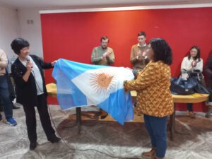 Antes de los discursos la ex concejal Gloria Arguello le donó a la consejera Escolar Sandra Rodríguez una bandera para colocar en el edificio de ese organismo.