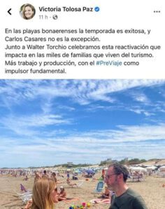 Tras el primer tuit, la legisladora borró su mensaje replicado en Facebook e Instagram y enmendó su error con una nueva frase que decía: “En las playas bonaerenses la temporada es un éxito. Junto a Walter Torchio celebramos esta reactivación que impacta positivamente en miles de familias que viven de la industria del turismo. Más trabajo y producción, con el PreViaje como impulsor fundamental”, escribió.