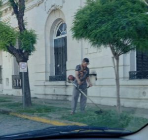 El episodio llamó la atención de los vecinos de esa localidad de la Sexta sección electoral que pasaron por el edificio municipal y lo fotografiaron con la motoguadaña en mano, arreglando la fachada en alpargatas y bombacha de campo.