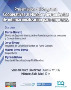 Mañana se llevará adelante la jornada realizada entre INAES, el Consorcio de Gestión de Puerto Quequén, el Banco Credicoop y la Agencia Argentina de Inversiones y Comercio Internacional.