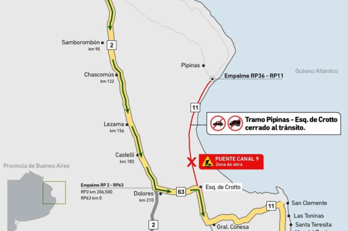 Debido a trabajos que AUBASA (Autopistas Buenos Aires SA) realizará sobre el puente Canal 9, en el km 215 de la Ruta 11, estará cerrada la circulación tanto a automóviles como camiones por esa vía desde este lunes 23 a las 7 hasta el viernes 27 a las 12, en el tramo que va desde Pipinas hasta Esquina de Crotto.