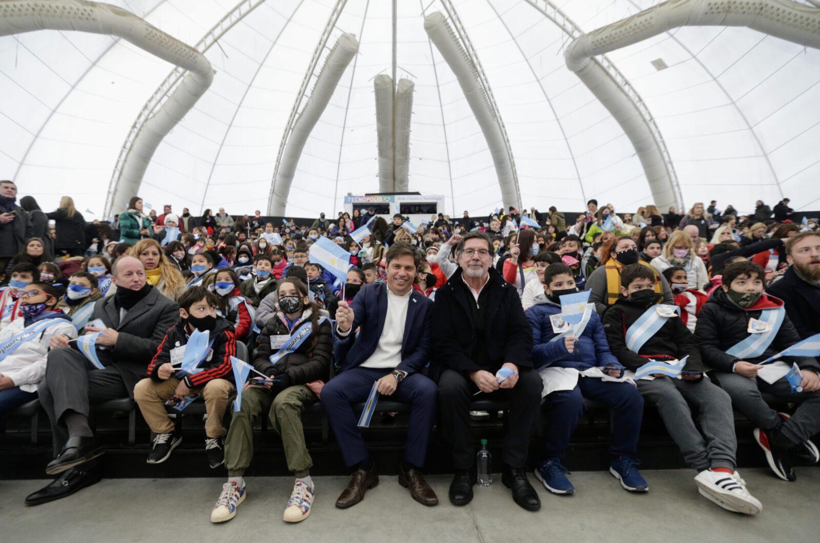 El gobernador de la provincia de Buenos Aires, Axel Kicillof, encabezó esta mañana en Tecnópolis el acto de promesa de lealtad a la Bandera Nacional por parte de alumnos y alumnas de escuelas primarias bonaerenses, junto al director general de Cultura y Educación, Alberto Sileoni.