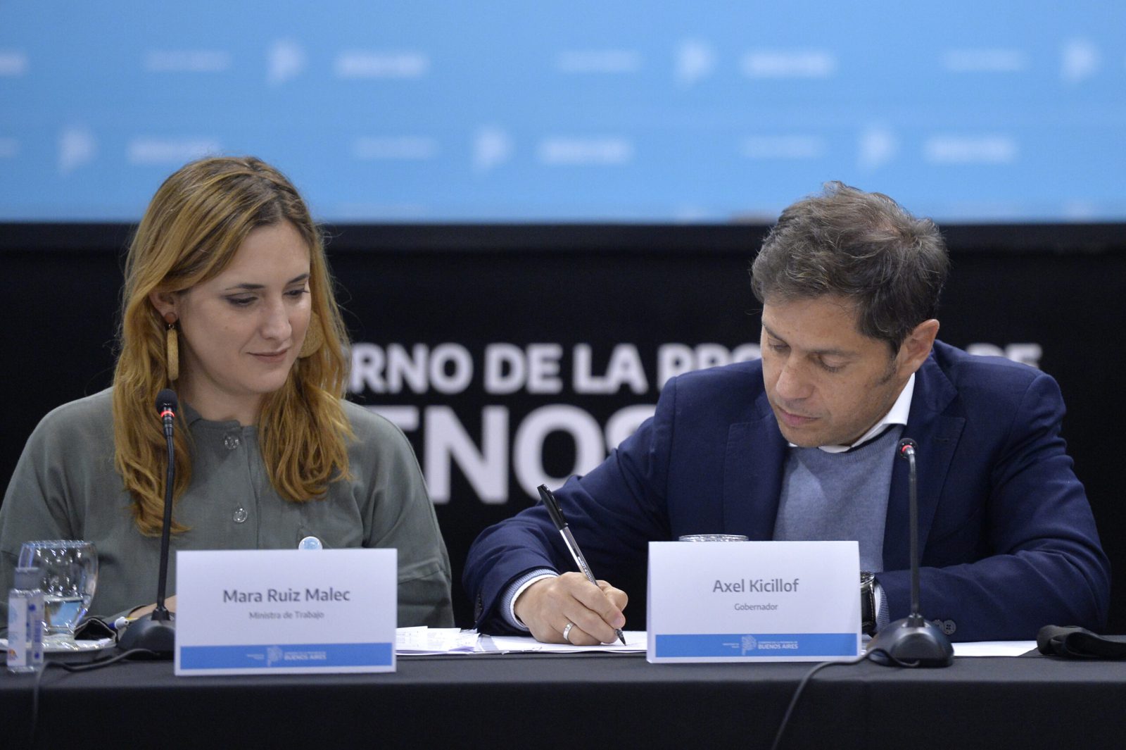 El gobernador de la provincia de Buenos Aires, Axel Kicillof, suscribió esta mañana un acuerdo paritario que amplía las licencias parentales de las y los trabajadores del Estado contratados bajo los regímenes que establecen las leyes 10.430 y 10.471.Fue en el Salón Dorado de la Casa de Gobierno, junto a las ministras de Trabajo, Mara Ruiz Malec; y de las Mujeres, Políticas de Género y Diversidad Sexual, Estela Díaz; el ministro de Salud, Nicolás Kreplak; y representantes de los gremios estatales.