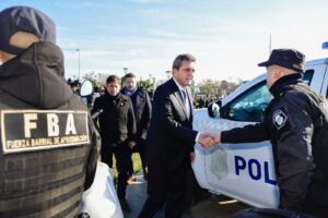 El ministro de Economía, junto al gobernador bonaerense, Axel Kicillof, al ministro de Seguridad de la provincia, Sergio Berni, y al intendente de Merlo, Gustavo Menéndez, participó de la entrega de nuevos patrulleros, motovehículos y efectivos de la Unidad Táctica de Operaciones Inmediatas (UTOI).