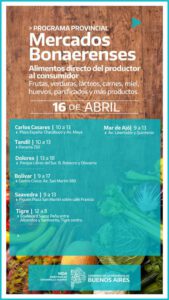 El programa cuenta también con una aplicación, “Mercados bonaerenses”, que permite conocer cuál es la feria más cercana y también posibilita vincularse, en algunos casos, con los productores que tengan venta directa a precios mayoristas.