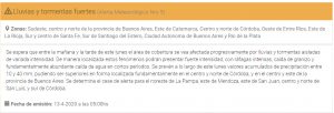 Según señaló el organismo, se espera que entre la mañana y la tarde de hoy el área local se vea afectada progresivamente por lluvias y tormentas aisladas de variada intensidad. Además, señaló que “de manera localizada estos fenómenos podrán presentar fuerte intensidad, con ráfagas intensas, caída de granizo y fundamentalmente abundante caída de agua en cortos períodos”.