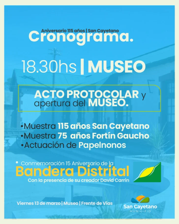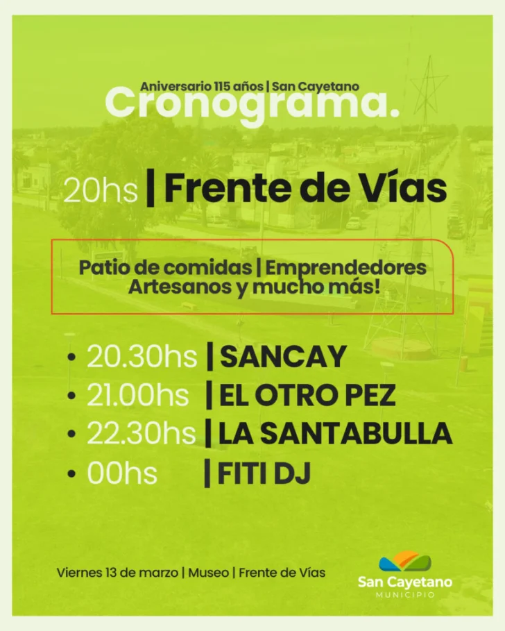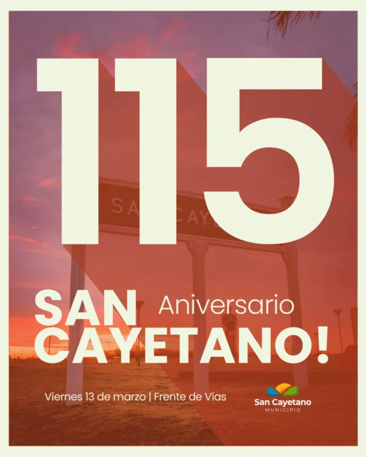 La ciudad de San Cayetano celebrará mañana su 115° aniversario con una jornada que combinará historia, cultura y música en vivo para toda la comunidad.