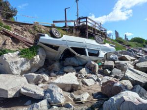 Un Renault 12 apareció esta mañana con las ruedas para arriba tras caer a las rocas en el ingreso a la escollera, del lado de la pileta de maniobras.