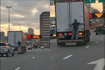 Un joven fue visto colgado de la parte trasera de un camión en la Autopista 25 de Mayo y generó temor entre los otros automovilistas, quienes algunos grabaron el insólito accionar.