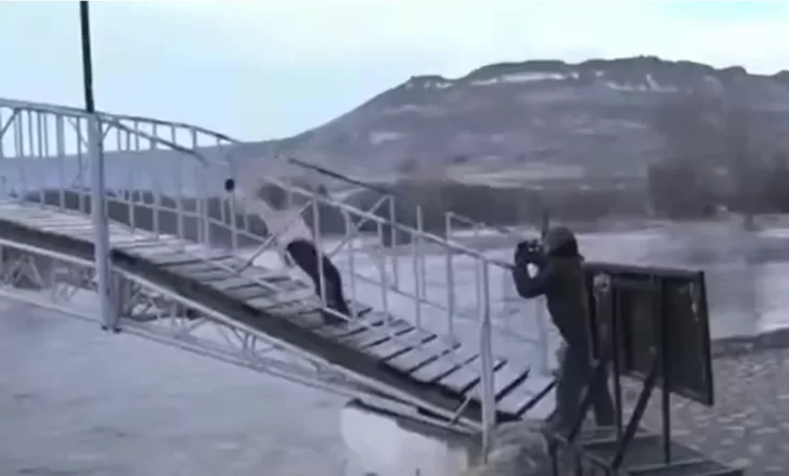 “La helada es tal que cuando subís, este puente resbala. Vamos a bajar con mucho cuidado, si estás en Junín de los Andes, tenés que venir al Puente Banana”, sostuvo, pero cuando ya estaba por llegar al otro lado, se resbaló y cayó de cola al piso.