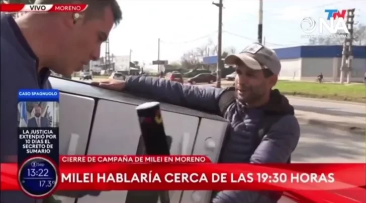 Durante la nota, un militante libertario interrumpió al hombre para expresar su apoyo al Presidente al grito de “¡Grande Milei y viva Milei, ponemos el pecho por Milei!”.