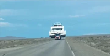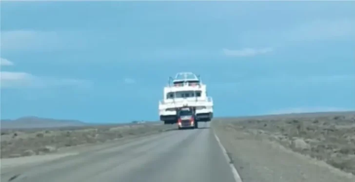Un grupo de turistas que viajaba por una ruta del sur argentino vivió una escena tan insólita que parece sacada de una película: se encontraron de frente con un enorme catamarán que avanzaba sobre un camión, ocupando casi la totalidad de la calzada y “navegando” por el asfalto.