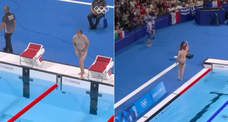 Lo cierto es que, más allá de que en un principio se especuló que era un intruso, este hombre era un guardavidas de la organización que se tiró al agua para recuperar el gorrito de la nadadora del equipo de Estados Unidos Emma Weber.