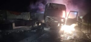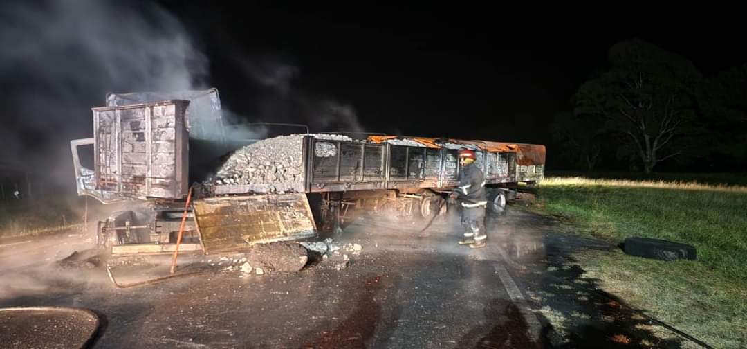Un camión Semirremolque Renault Premium, propiedad de la Empresa Pausini de la localidad de Oriente que, se prendió fuego anoche cuando transitaba el km 401 de la Ruta Nacional 3, transportando Caolín, similar a arcilla.