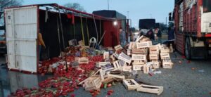 El hecho ocurrió en la curva de la entrada al Autódromo, cuando por motivos que son de investigación, un camión con una importante carga de verduras perdió el control y volcó, lo que generó que los cajones en los que llevaba tomates, albahaca y otros vegetales volaran y se estrellaran contra el suelo.