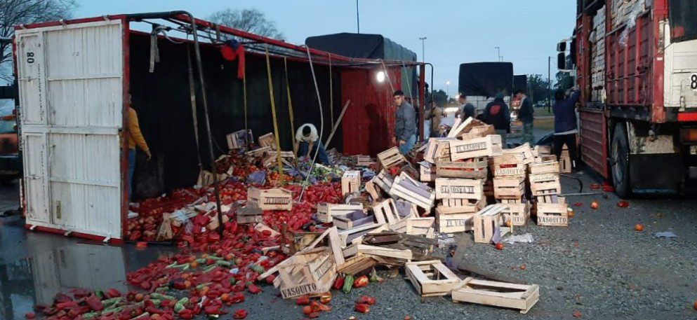 El hecho ocurrió en la curva de la entrada al Autódromo, cuando por motivos que son de investigación, un camión con una importante carga de verduras perdió el control y volcó, lo que generó que los cajones en los que llevaba tomates, albahaca y otros vegetales volaran y se estrellaran contra el suelo.